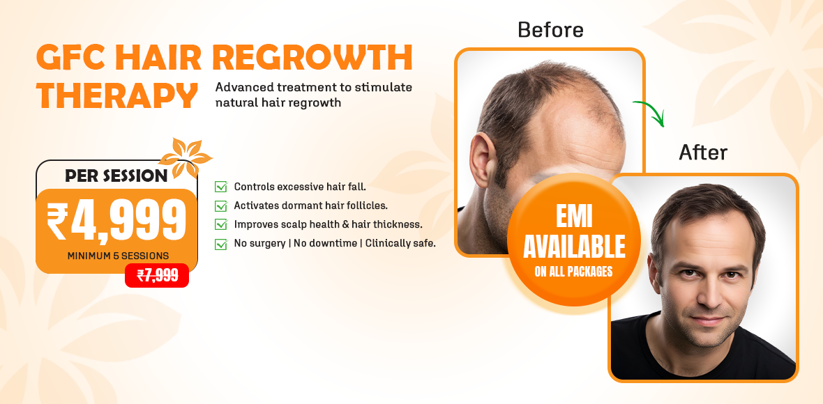 GFC (Growth Factor Concentrate) uses your own growth factors to stimulate weakened follicles, improve density and reduce hair fall safely. Results increase progressively over sessions.